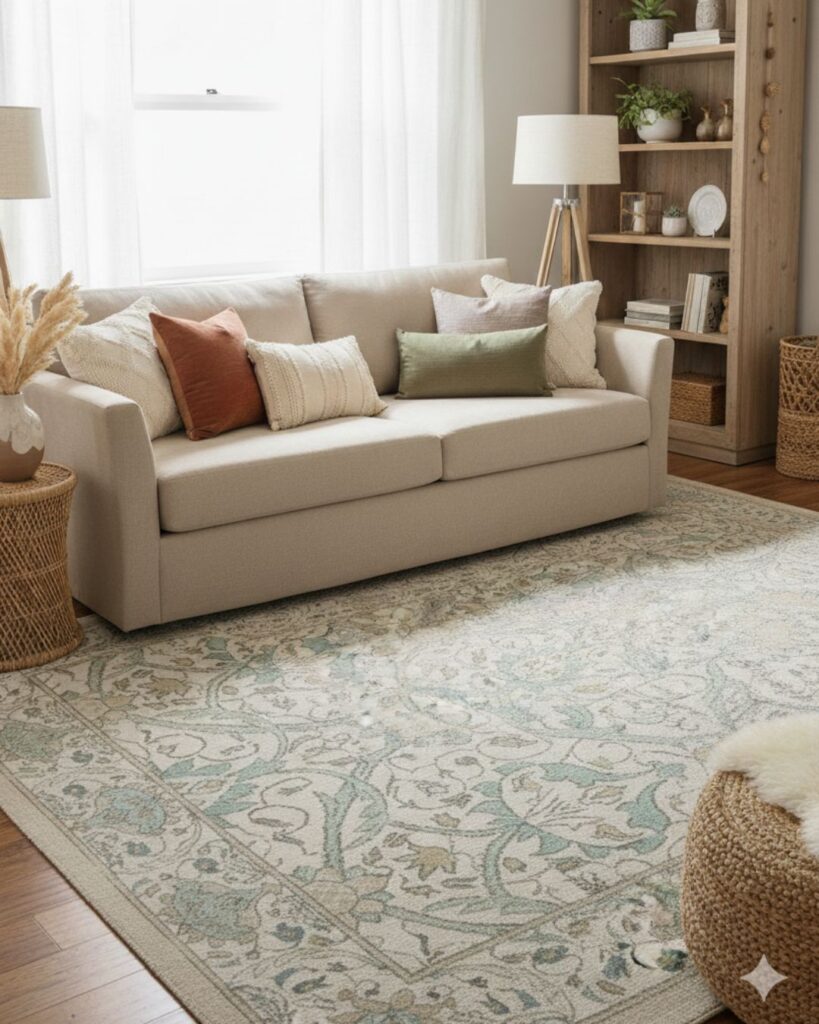Laine Ivory & Natural tufted rug under a light armchair in a boho chic living room with natural textures.